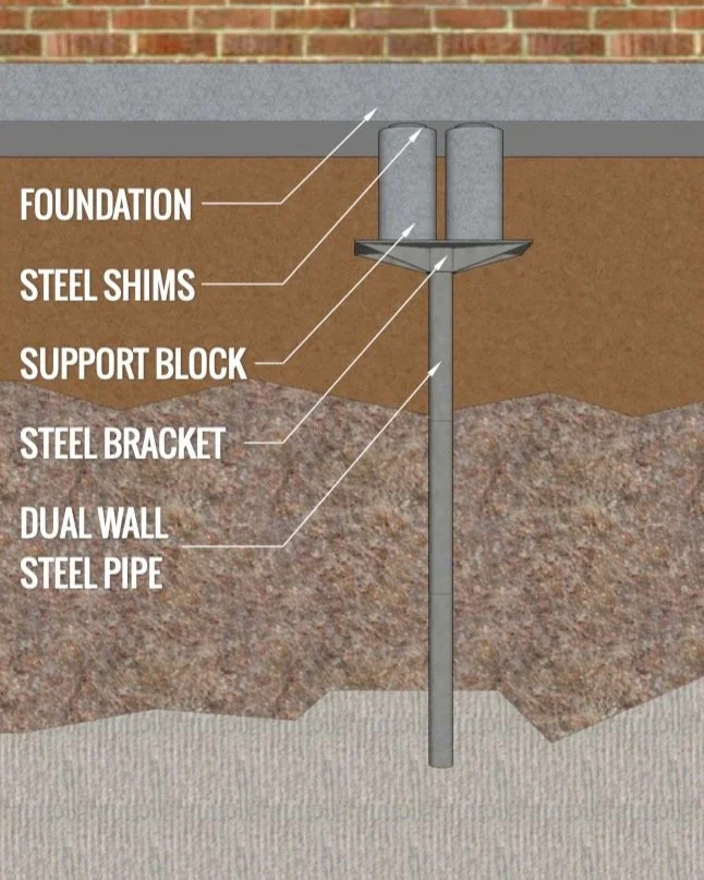 One-foot sections of Double Wall steel pipe are hydraulically pressed against the bottom of the foundation. This drives the pipe into the ground against the weight of the house. The last section is concrete so all steel sections are below the oxidation level.
